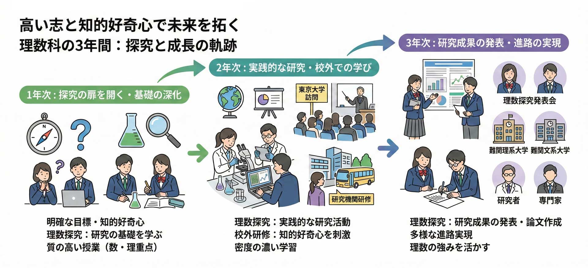 また、大きな特徴の一つである 「理数探究」。 大学で行う「研究」とは何か、高校での授業と何が違うのかを考えながら3年間かけて行う重要な科目です。